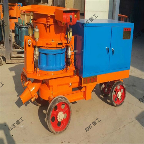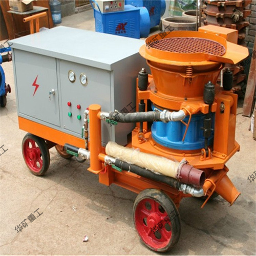 干式喷浆机简称干喷机,是将一定比例的水泥、砂子及小石子均匀搅拌后,借助压缩空气为动力,使拌合料连续地沿着输送管路被吹送到喷射嘴处。与来自压力水箱的压力水混合成为半湿的混凝土,以每秒80~100米的速度喷射到工作面上,使之达到衬砌的效果。喷射时,喷嘴一般距离工作面1米左右,一边喷射,一边慢慢画圈移位。