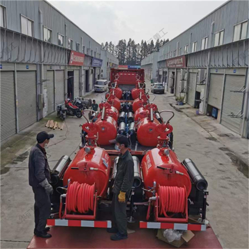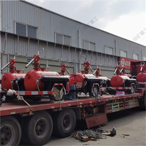 移动干粉灭火装置,以高压氮气为动力,将储罐内干粉灭火剂通过干粉炮或干粉枪喷向保护对象,由于干粉的比重较大,在气流的作用下能覆盖到火上不致被气流冲散。干粉在火焰的作用下破坏了原有的结晶,以新的化学物质中断了燃烧的链式反应,窒息火焰,同时干粉在分解过程中大量吸热,使着火区域温度迅速下降,从而控制扑灭火灾。