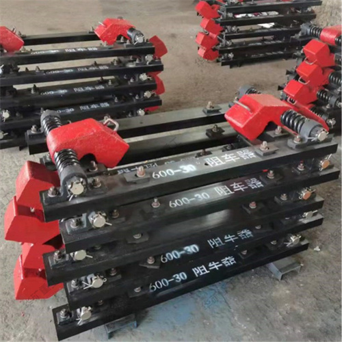 气动阻车器由左、右轮挡部件、机座、气控装置等组成。轮挡关闭时阻挡矿车轮进行阻车,具有缓冲作用。轮挡打开时矿车可通过阻车器,轮挡的关闭和打开由气控装置控制,搬动气控装置的气控阀,气缸推动阻车轮挡打开,当矿车通过后,反向搬动气控阀,气缸推动阻车轮挡关闭。