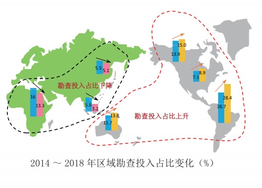 2018年全球矿产勘查投入主要集中在南北美、澳大利亚和非洲,占比79%。