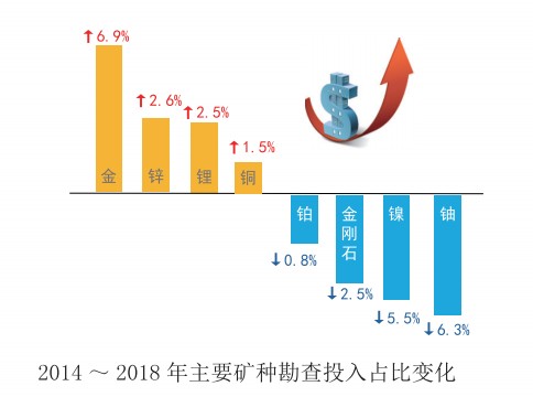 四、全球矿产品市场震荡调整,矿业市场结构出现分异。2019年,受供需基本面及突发事件影响,石油、铜、锂、钴等价格整体呈下降态势,铁矿石、镍价格短期出现暴涨。受全球贸易摩擦、地缘政治冲突加剧影响,黄金价格大幅上涨。主要矿业公司股价整体随矿产品价格震荡变化。全球固体矿产勘查投入缓慢回升,但中国固体矿产勘查投入持续下降。从勘查主体看,大型矿业公司投入占比增加,中小型勘查公司占比下降。从勘查阶段看,草根勘查投入持续下降,详查和勘探投入持续增长。从勘查矿种看,金、铜、锌占比持续增加,铀、镍、金刚石占比持续下降。从勘查区域看,大型矿业公司逐步聚焦南北美、澳大利亚等地区,大幅降低非洲、东南亚等地区勘查投入。