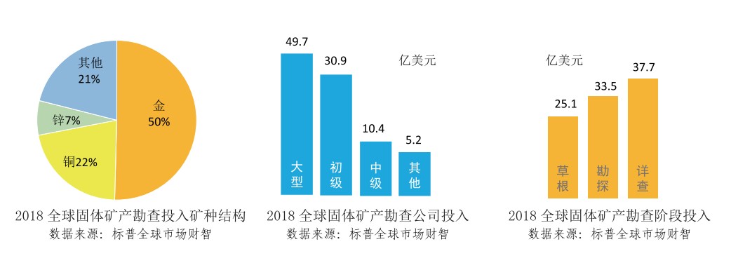 全球固体矿产勘查投入主要集中在金、铜和锌等矿种,2018年勘查投入占比分别为50%、22%和7%。大型矿业公司是勘查市场主力军,草根勘查投入低于后期成熟阶段的勘查投入。
