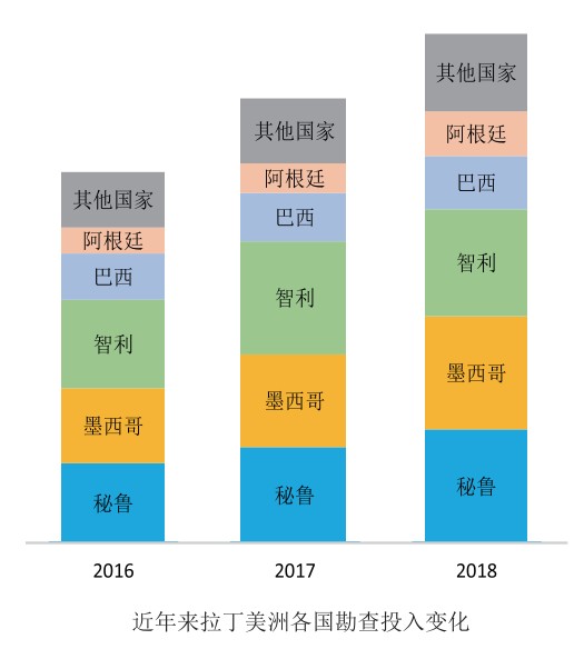 近3年,秘鲁和巴西的勘查投入占比持续上升,2018年,秘鲁的大型铜矿项目和巴西具有竞争力的铁矿石项目已经成为拉美矿业投资的主要驱动力。