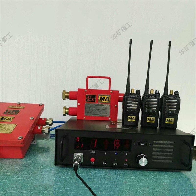 本系统实现井上机房人员和斜井机车或竖井吊罐中维修人员相互通话的通讯设备。它可以有效地传递语音及打点信号,使井上有关人员和斜井及竖井内人员建立起紧密的联系。系统由设在机房内的基地台、稳压电源,铺设在井道中泄漏电缆以及人身携带的手持机所组成。基地台收到的语音、打点信号由机外的话筒喇叭发出,在85dB的噪音环境中仍能与手持机进行通话或打点联系。(基地台具有记忆并显示打点次数的功能)。该系统配套的设备均可以在具有煤尘、爆炸性气体的矿井中使用。安装了这套设备,能够保障斜井人员及竖井检修人员安全、可靠地工作。基地台、稳压电源安放在机房的桌面上,使用127V交流照明电。