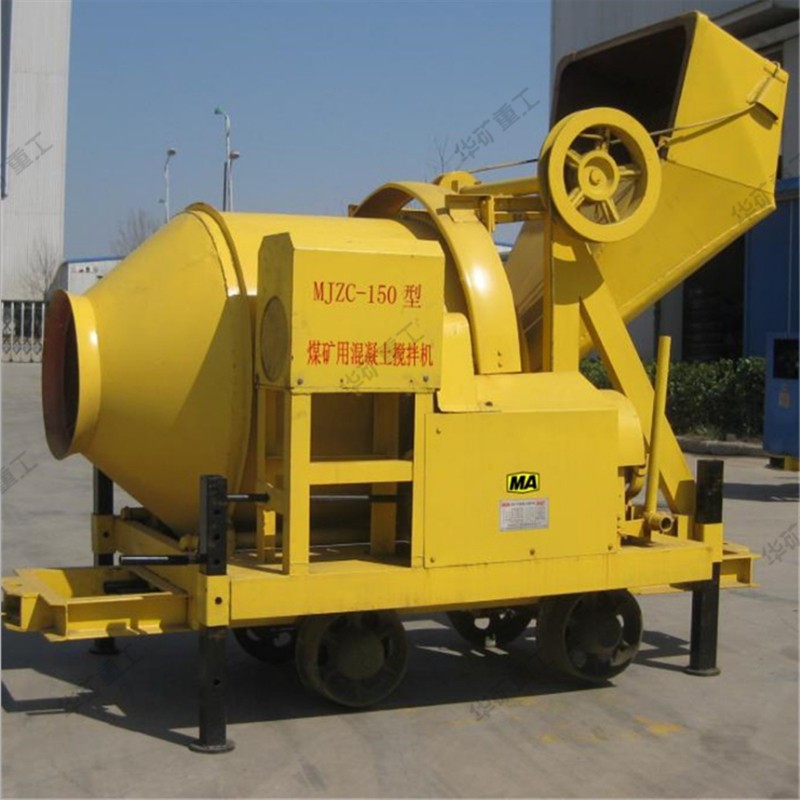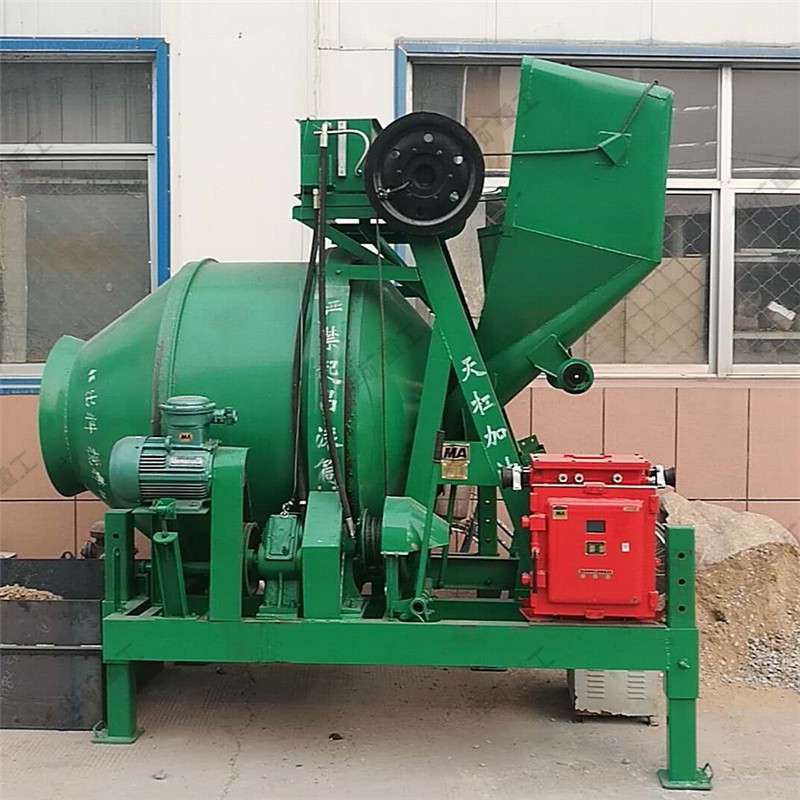 煤矿用混凝土搅拌机属于自落式双锥反转出料移动式混凝土搅拌机,可搅拌塑性和半干硬性混凝土,搅拌筒正转搅拌,反转出料。适用于矿山井下巷道等窄小工作环境;齿轮转动,结构紧凑,运转可靠;电控系统均采用安标产品,可适应于隔爆环境下作业。