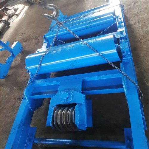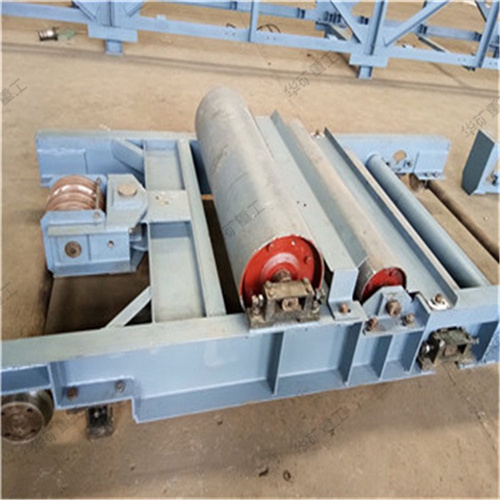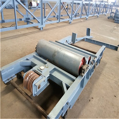 皮带输送机拉紧游动小车由车架、换向滚筒、滑轮组、车轮等组成,滑轮组装在车身后都与另一滑轮组相适应,其位置可受力时车身不被抬起,这样对保持车身稳定,防止换向滚筒上的胶带跑偏效果较好,车身下部还装着止爬钩,用以防止车轮脱轨掉道。游动小车向左侧移动时,胶带放出,机身伸长,游动小车向右侧移动时,胶带储存,机身缩短,通过钢丝绳拉紧游动小车可使胶带得到适当的张紧度。