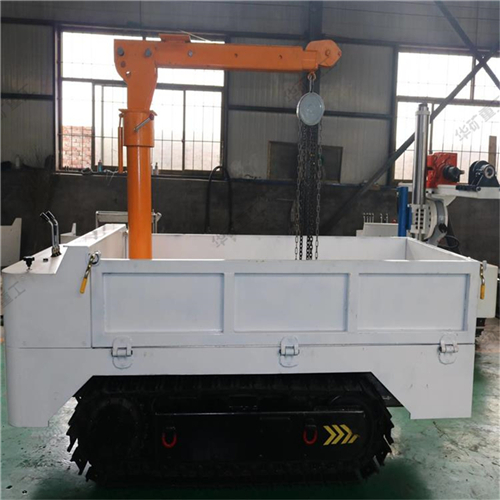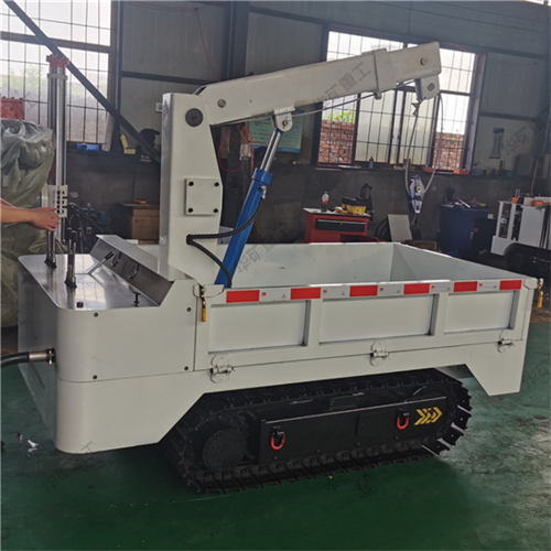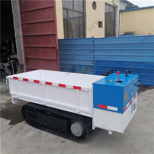 该运输车由空气净化器、油雾器、履带、气马达、气动泵站、履带行走控制阀、油箱、上平板、挡板、挂绳孔、护罩等组成。空气净化器能有效的将气源中的杂质过滤掉,油雾器为马达提供足够的润滑,延长机器使用寿命;油箱与车架为焊接一体式,平铺于履带内,有效的节省了空间;挂绳孔直接开在平板上,既节约空间,又能满足运输过程中对货物的捆绑;采用气马达带动齿轮油泵,运行平稳可靠;挡板可保护运输车功能部件及操作者;履带控制阀采用弹簧自动复位式,通过控制阀杆的不同角度可以控制履带行走的速度。