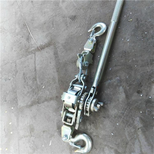 手扳棘轮紧线器的使用方法是;先将手扳棘轮紧线器的卡板扳到松线的位置,将钢丝绳全部拉出,再把挂钩挂在固定点上,然后将卡板扳到紧线位置,把手扳棘轮紧线器沿着导线(或者绳索)向前伸,把需要拉紧的导线(或者绳索)卡入手扳棘轮紧线器的卡线口内,用一只手把卡入手扳棘轮紧线器的卡线口内的导线捏紧,一只手搬动手扳棘轮紧线器的收线扳手,将导线收紧,待导线(或者绳索)牢牢的被卡紧后就可以慢慢收紧导线或者绳索了。
