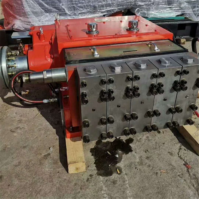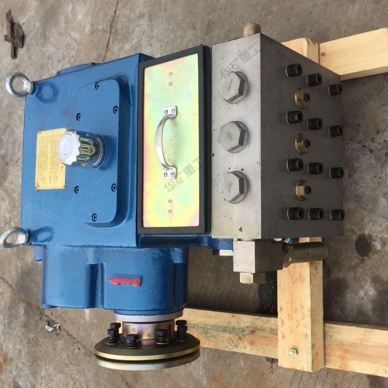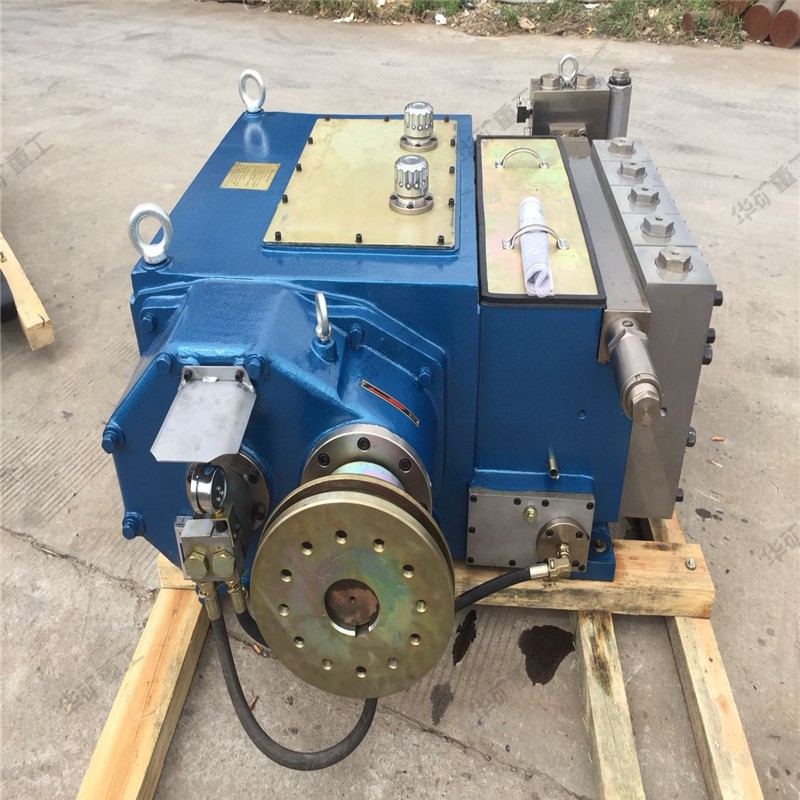 乳化液泵主要由曲轴箱、高压钢套、泵头等组件组成。泵的液力端采用分立的泵头组成,泵头下部安装吸液阀,上部安装排液阀,排液腔由一个高压集液块与五个分立的泵头高压出口相连,高压集液块一侧装有安全阀,另一侧装有卸载阀。曲轴箱设有冷却润滑系统,安装在齿轮箱上的齿轮油泵经箱体下方的网式滤油器吸油,排出压力油经过设在泵吸液腔的油冷却器冷却后到中空曲轴润滑连杆大头。