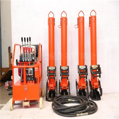 当需要起落整组道岔时,首先将每个单元的液压起拨道油缸对称摆放在道岔钢轨两侧,卡在钢轨侧面上,液压泵站摆放在道岔钢轨中间的岔枕上,联接好高压油管,启动内燃机,由遥感控制器控制换向阀的液压油的流向,达到液压起拨道油缸的伸缩,就可以进行道岔的起落作业。