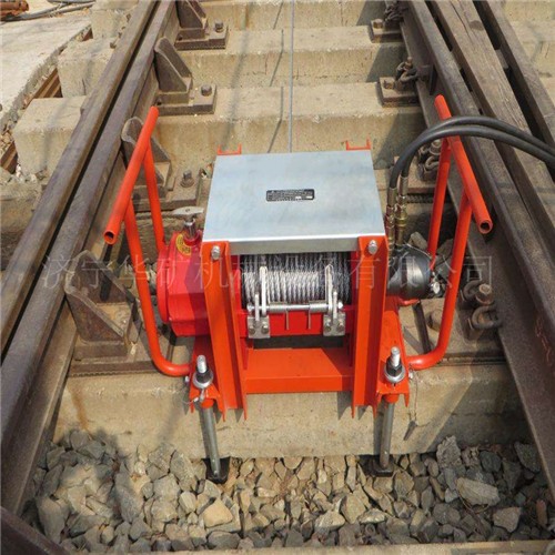 6、液压横向牵引绞车,抬起道岔后插入滑轨,采用液压马达卷动钢丝绳,拖动道岔横向移动;